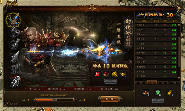 最后在游戏内更有多种多样的系统与设定,翅膀、神武、炼魂、神兵等众多系统等待你一一提升,而游戏内也提供了众多活动与玩法帮助玩家提升。在神兵系统内,所有玩法一览无余,玩家在这里完成每日的活动积攒活跃度,即可提升自己的实力,同时更有机会领略到各种独家玩法,囚魔之路、炼狱迷宫等众多全新特色玩法等待你来体验!现在就加入360uu《攻铩》加强版,开始你的传奇人生!