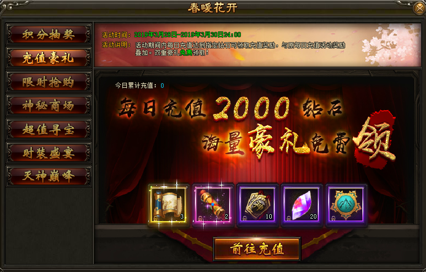 2. 活动期间内,每日充值达指定钻石数额,即可领取充值奖励,可原每日充值奖励叠加领取。