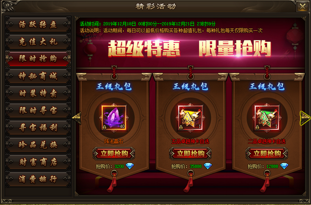 活动内容:活动期间,每日可以超低价格购买各种超值礼包,每个礼包每天限购一次。