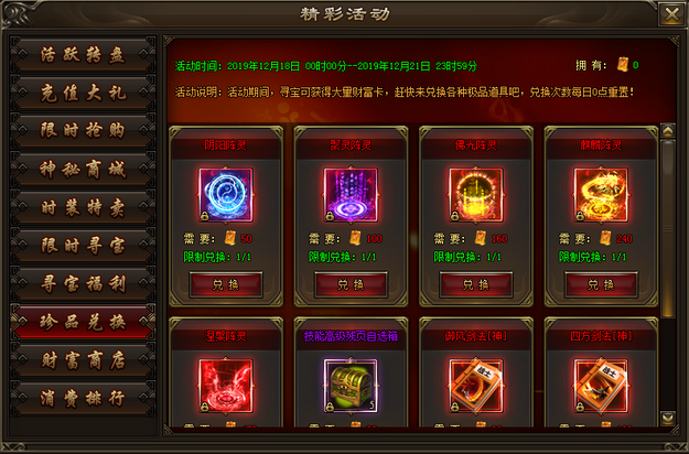 活动说明:活动期间将限时开放珍品兑换,可以使用财富卡兑换阵法道具,[神]技能书。