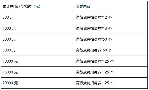 活动规则:活动期间内,真实充值达到以下档位,可获得相应国战玩法—高级武将招募券。