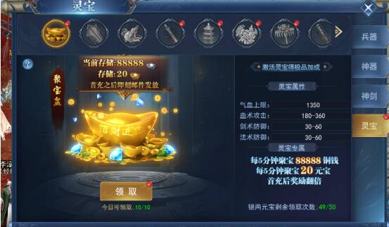 灵宝有聚宝盆、芭蕉扇、紫金葫芦等9种,每种都有特殊属性效果。聚宝盆每5分钟可聚宝铜钱和元宝,可领取50次。芭蕉扇有对怪伤害加成的特殊属性。还有pk伤害加成减免,加攻防血的特殊灵宝,越早激活越好。