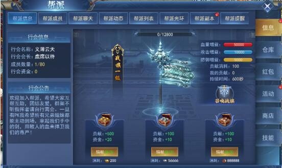 每天可进行捐献增加门派资金和获取个人贡献,贡献可用来升级门派技能。