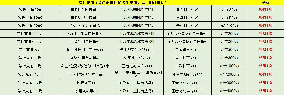活动规则:从创角时开始计算,总累充返利每个档次奖励终身仅可领取1次