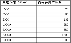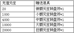活动期间,玩家充值至指定额度,即可获得对应的元宝转盘符,使用元宝转盘符转动转盘,将可随机获得转盘上任意额度的元宝奖励。每个额度转盘只能转一次,每一轮转完之后将开启下一轮转盘。元宝转盘升级后,最高可累计获得30520非绑定元宝返利哦!