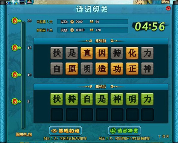 ②点击“排序前”诗词将其排列好,即为闯关成功并进入下一句诗词的闯关,过程中可使用“慧眼如炬”(只能用1次)和“请仙问灵”(只能用3次)两种锦囊;