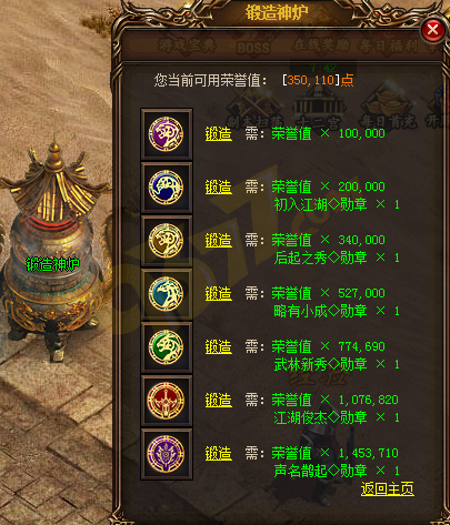 当玩家获得足够高的荣誉值后,便可到荒漠土城的锻造神炉处锻造荣誉勋章,第一个荣誉勋章——初入江湖◇勋章需要100000荣誉值,你攒够了吗?荣誉勋章佩戴后可增加人物攻击,可强化获得强化属性。