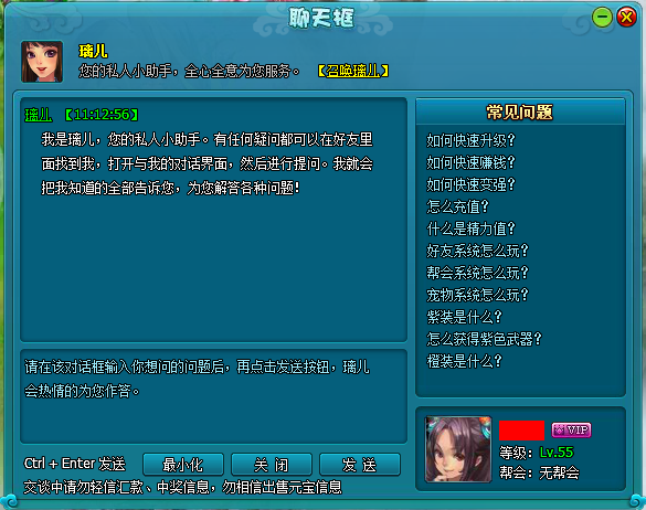 点击璃儿头像,打开私聊窗口,您就可以和璃儿聊天,并向璃儿询问游戏中的问题了!