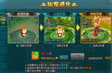 在仙宠主界面,点击“进化”可打开“仙宠进化”界面。