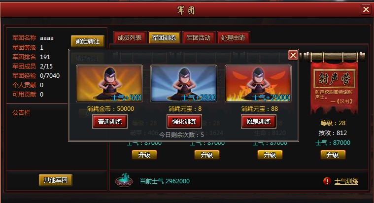 士气可通过士气训练获得,点击士气训练弹出士气训练界面,通过消耗不同金币或者元宝来获得不等士气。