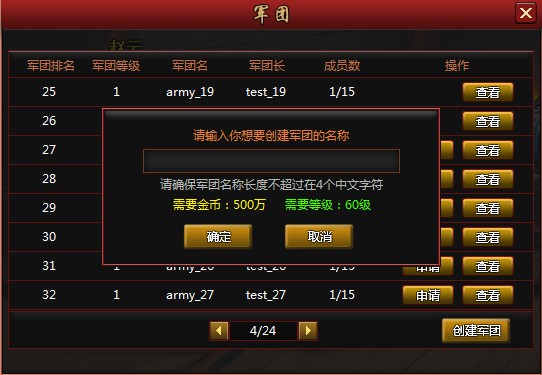 点击创建军团可进入创建军团界面,创建军团需要500万金币,等级需求60级以上,军团名称最多4个中文字符。