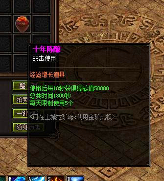 十年陈酿给玩家带来的是每隔10秒5W经验值,总共加成900W经验,每天限制使用5坛(好酒虽美,也不能贪杯)