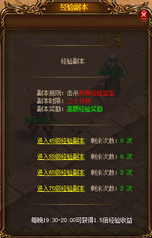 副本永远是赤月传说既主线任务、天师任务之后,最为重要的升级途径,尤其是经验副本,加上经验加成,一定会大大提升升级的速度。