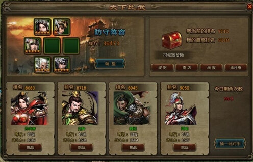 配置自己的防守阵容,用以应对其他英雄的挑战!战胜其他英雄,登上“天下比武第一“的宝座!