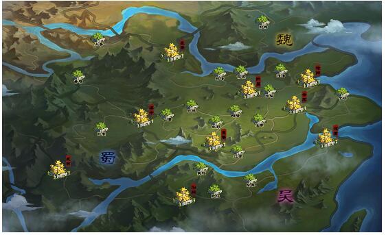从地图上看,天下共有27座城池,其中九座大城:成都、荆州、襄阳、建业、合肥、徐州、许昌、长安、汉中;十八座小城:邺城、濮阳、陈留、街亭、荥阳、会稽、剑阁、夷陵、新野、南阳、淮南、合肥、武陵、柴桑、江夏、下邳、官渡、宛城、上庸。