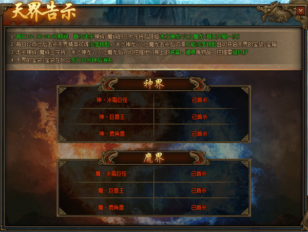 在每天12点至24点期间,天界中每个半小时神魔双族都将刷新出三大守将,成功击杀将有机会获取任务道具和沉落钥匙,在三位守将被击杀后,冰之神龙与火之魔龙将降临天界,更强大实力与万能沉落钥匙等你抢夺,持有钥匙即可开启天界宝箱,丰厚的奖励打开既有惊喜。同时三大守将与两位巨龙在死后,玩家们还可以挖掘出他们身上的装备和道具,同样的惊喜在等待你来认领。闯荡凌霄天界,挑战两大巨龙,这个4月,加入360uu《传奇世界》网页版全新地图,开始这个春天最不可错过的传世之旅!