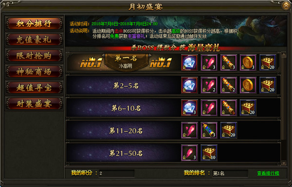 2. 活动期间内,击杀boss可获得积分,击杀越高级的BOSS获得的积分越高,根据积分排名可免费获得奖励。