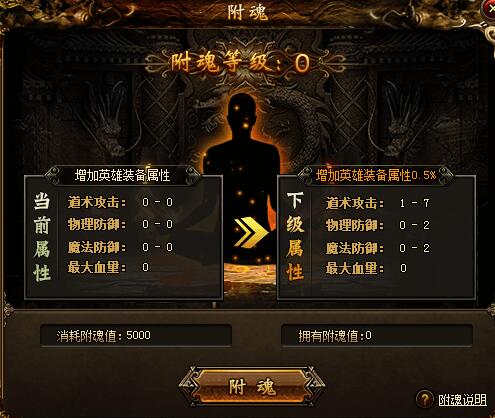 2.开服9天英雄等级达到3转后开启英雄附魂功能,提升附魂等级可提升英雄装备指定属性的百分比,装备越好!属性增加越高。