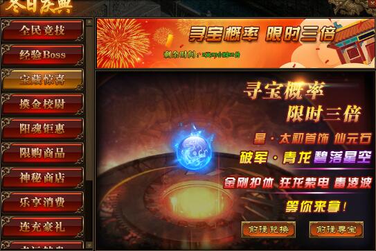 1.活动期间,玩家寻宝概率翻倍,极高几率获得星·太初首饰,特戒钢纹,碧落星空、仙元石,传世灵器、传世灵甲,封神秘法书页以及破军·青龙