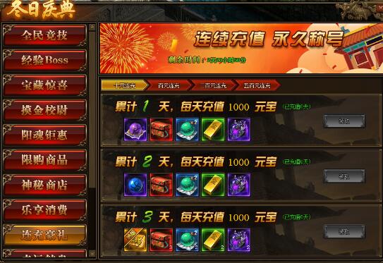 2.累积充值达到三天,可领取稀有称号