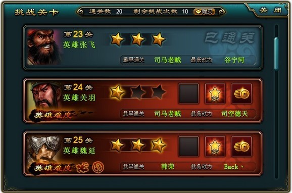 英雄难度关卡每次挑战需要消耗一次挑战机会,每天共有10次挑战机会。