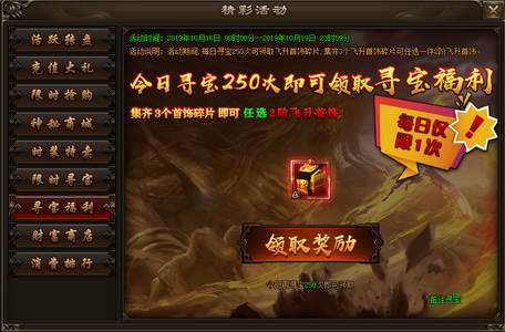 活动内容:活动期间,每日寻宝250次可额外领取首饰碎片,集齐3个首饰碎片可任选一件2阶飞升首饰。