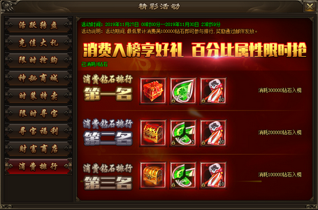 活动内容:活动期间,最低累计消费满100000钻石即可参与排行,排行前3名可获得超级大奖。奖励将在活动结束后通过邮件发放。