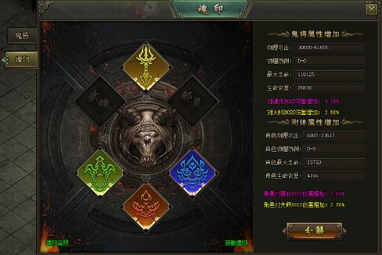 (6)佩戴魂印可增加大量鬼将自身属性及附体属性,穿齐整套魂印可激活套装属性,提升鬼将及人物对魂化BOSS、大师BOSS的伤害%加成