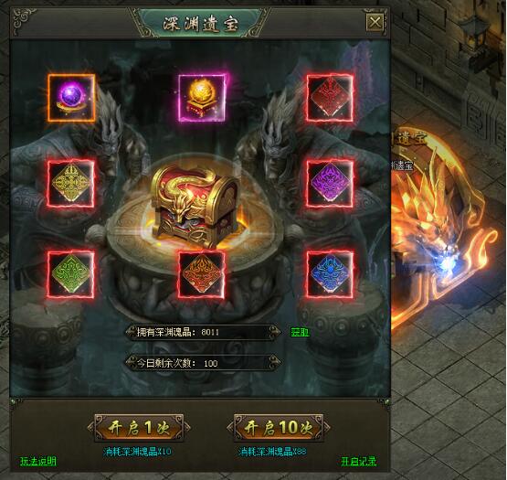 (1)在深渊鬼都各层均会刷新深渊遗宝宝箱,点击宝箱可打开遗宝开启界面