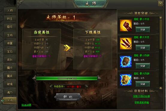 2)潜能突破等级上限初始为5,大师等级每提升10级,可突破上限+5