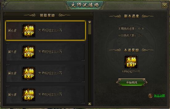 (5)每挑战成功1波,可在副本入口界面领取1次奖励,获得海量大师经验值