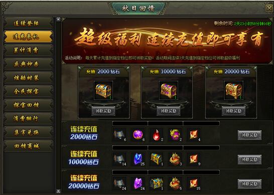 活动说明:活动期间,每天累计充值到指定档位即可领取对应奖励,连续充值3天可领取连充大奖
