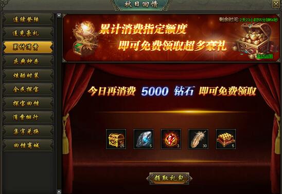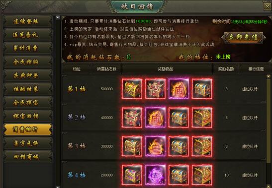 活动说明:活动期间,累计消费达到100000钻石的玩家参与排行,达到对应档位的玩家奖励在活动结束后以邮件的方式进行发放