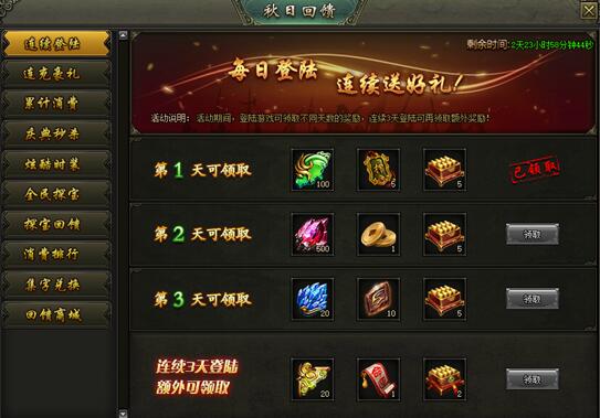 活动说明:活动期间,登陆游戏可领取不同天数的奖励,连续3天登陆可再领取额外奖励