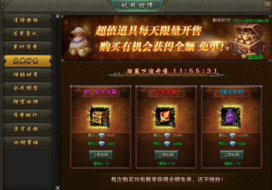 活动说明:活动期间,超值道具每天限量开售,购买就有机会获得全额免单!