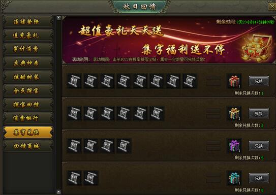 活动说明:活动期间,击杀BOSS有概率掉落字帖,集齐一定数量可兑换奖励!