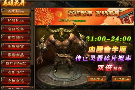 1.活动期间,玩家参与“多人副本-血腥回廊”,获得“传世灵器碎片”的概率翻倍;