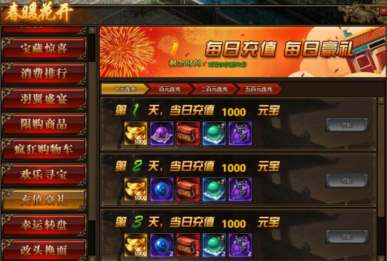 2.连续充值达到3天,奖励翻倍领,更可领取暗影晶石、地狱晶石、随机7级阵法宝珠、雷霆装备等贵重物品