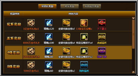 报名参加王者争霸并进入64强的军团,根据您在军团中的职位可以获得海量奖励。进入32强的军团,根据您在军团中的职位更可获得额外称号奖励