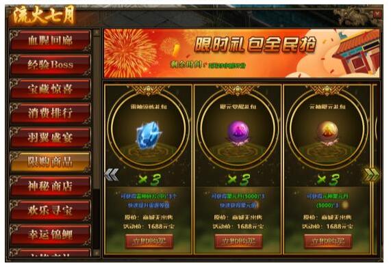 1.活动期间,玩家可在活动面板购买限购商品;(可翻页) 2.每个礼包每天只可购买一次,每天0点重置;