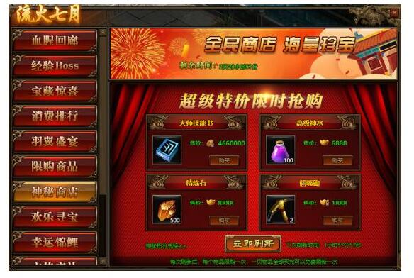 2.神秘商店每2小时自动刷新一次,也可用花费元宝立即刷新;