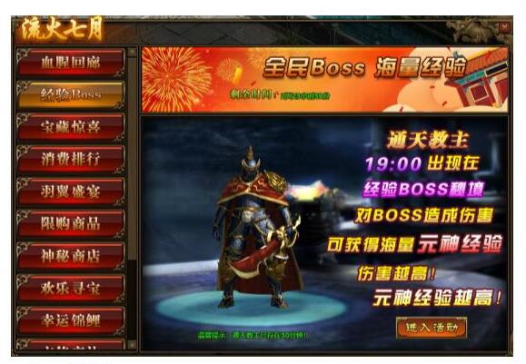 1.活动期间,每天19:00将在BOSS秘境中刷新BOSS,玩家可前往进行挑战; 2.活动中,玩家对BOSS造成的伤害,将在活动结束后转换成元神经验并发放; 3.提示:可使用攻击药水,暴击药水的药品来获得更高的伤害,更多的经验;
