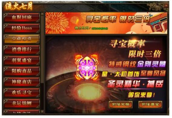 1.活动期间,玩家寻宝概率翻倍,极高几率获得星·太初首饰,传世灵器、传世灵甲,特戒钢纹,仙元石、碧落星空,传世灵器、传世灵甲,金刚灵髓、金刚精华,至尊风扬阵法以及圣灵精华(撼岳)