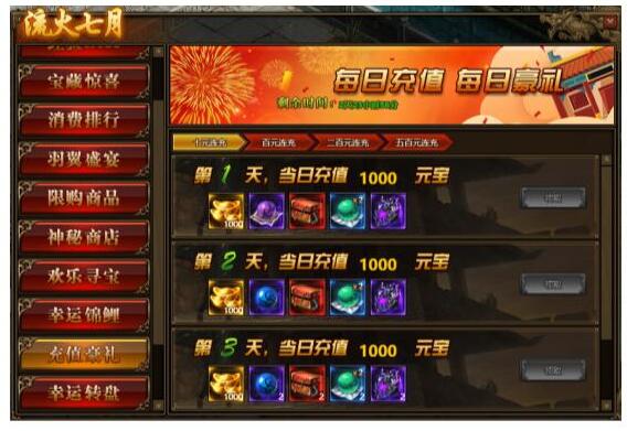 2.连续充值达到3天,奖励翻倍领,更可领取暗影晶石、地狱晶石、随机7级阵法宝珠、雷霆装备等贵重物品