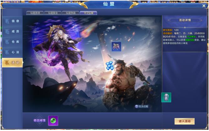 活动说明:仙盟守塔活动,活动期间击杀怪物,保护仙盟守卫神女,与盟友一起抵御怪物入侵,守卫成功可获得大量经验奖励。