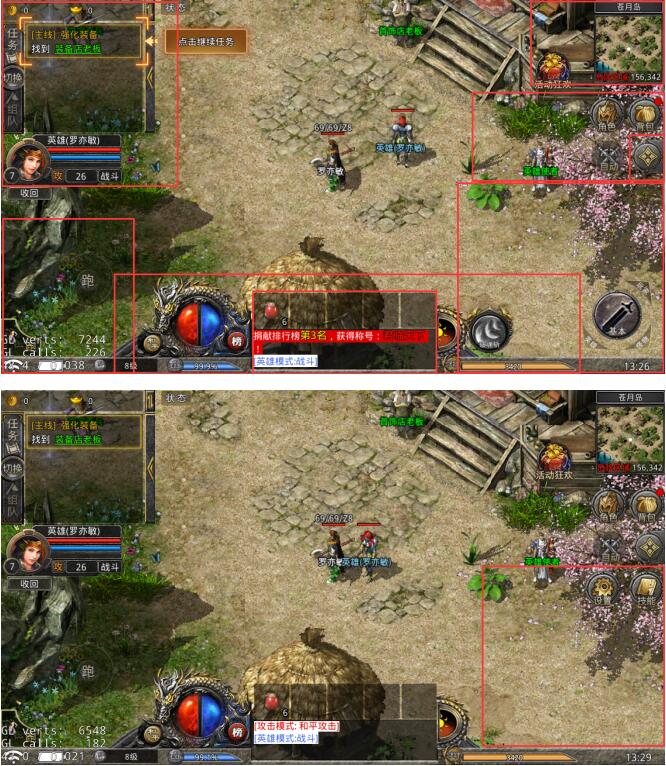 6. 角色重要属性:包括物品快捷使用栏,世界聊天,角色实时HP和MP,战斗模式切换,排行榜查看,等级经验条以及火龙珠标识。