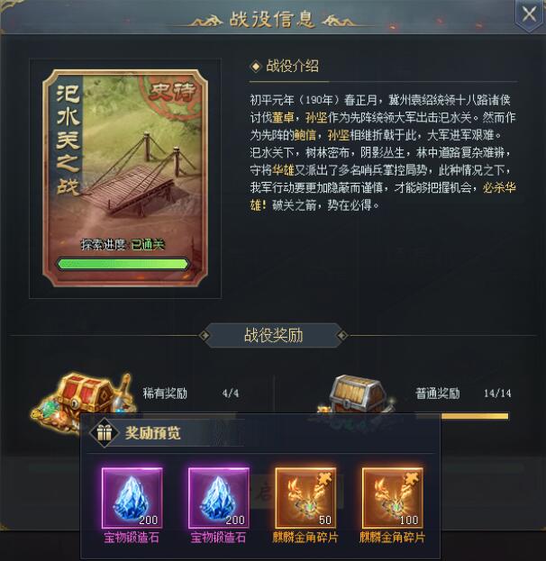副本内产出一次性的稀有奖励和将领宝物,副本奖励永久只能领取1次,重置副本不会重新生成奖励