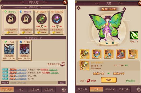 7.悬赏系统:多人PVE跨服互动玩法,玩家每天可免费领取一张悬赏令,也可以花元宝直接购买悬赏令,然后可选择自己想要发布的悬赏令进行悬赏发布:发送世界聊天、发送公会聊天、发送跨服聊天等等,邀请小伙伴一起砍Boss。悬赏令发布在跨服聊天,可邀请其他服的大佬,一起合作,击败悬赏BOSS,掉落丰富的灵宝装备和灵宝强化材料以及高级悬赏令。