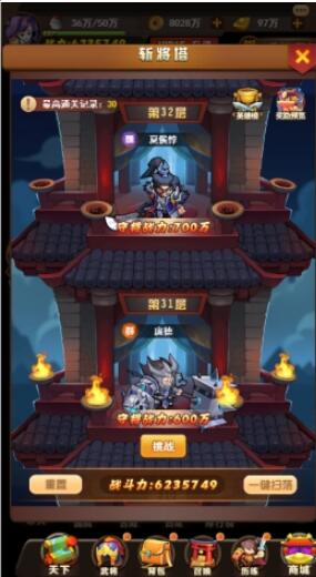 塔数越高,塔内镇守名将的战力越高,通关后获得的奖励越丰厚。