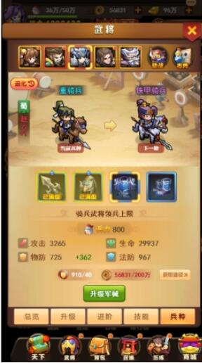 消耗兵符和铜币升级兵种,当升级达上限时,需通过突破令和铜币对兵种进行突破。兵种突破后能够大幅度增加各项属性和武将的领兵上限。